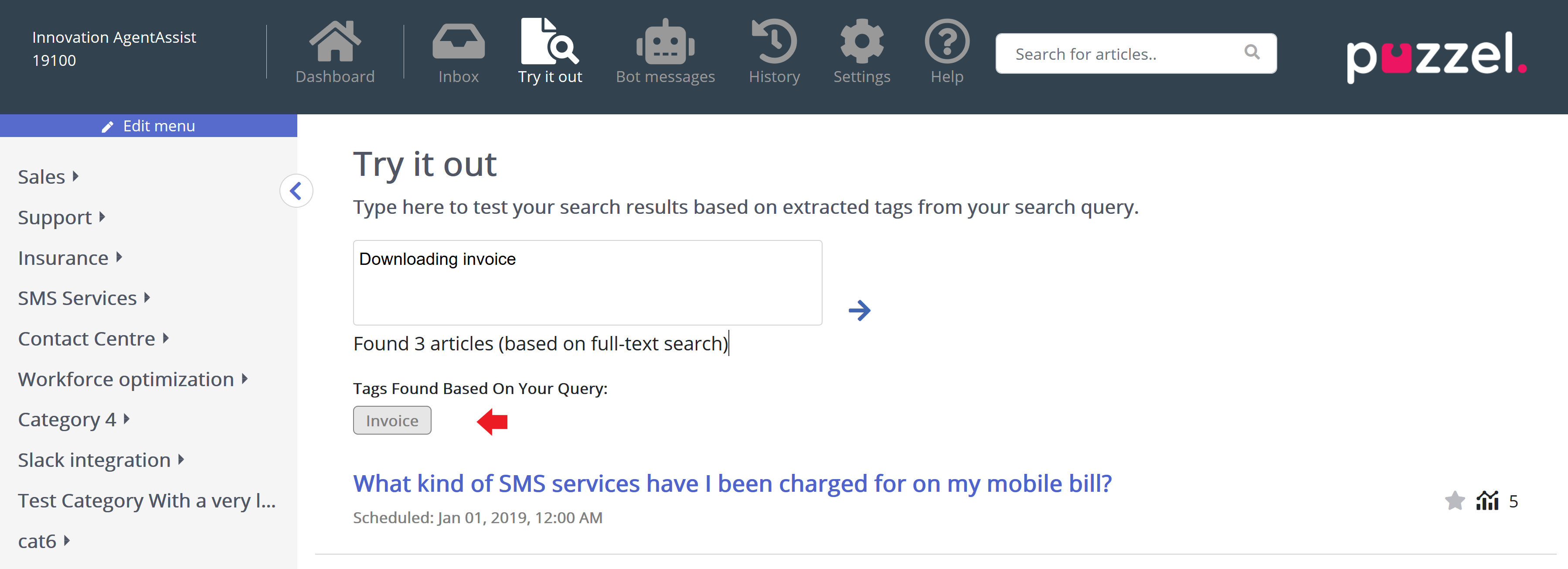 Now you can test the articles that will be presented to agents based on the question being asked. When you ask a question, some key words or phrases are extracted as tags which is used to find relevant articles. In the event that there are no tags found in the articles, the search engine will default to performing a full text search. A full text search will try to match words from the question to the content of the article and display these as results. If you see that there are no results from the Tags based search, and a full text search is being performed, you can try to copy the extracted tags shown under the input area and tag your articles using these extracted tags for better results.