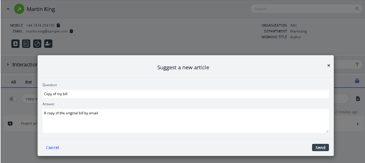 Agents can suggest new articles directly from Agent Assist Knowledgebase tab with a title and content.