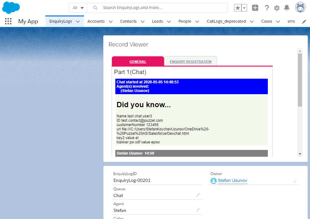 Viewer for chatlogs, recordings and enquiry registration