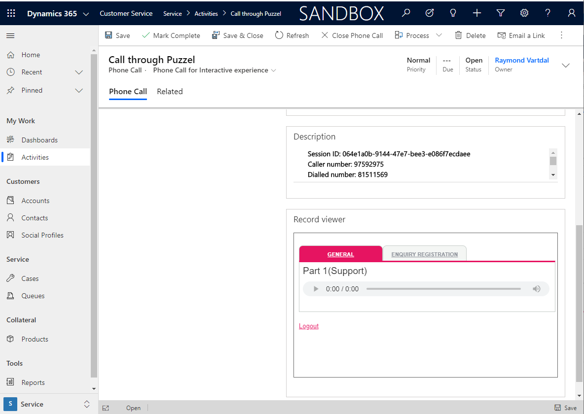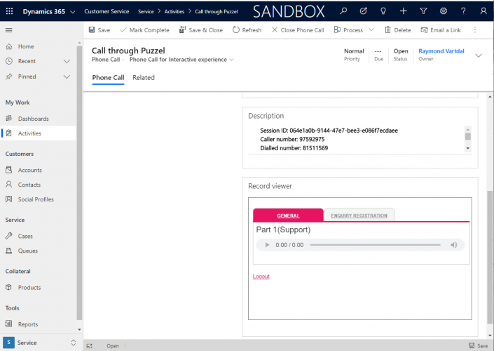 The viewer depends on respectively the EnquiryLog in Salesforce and the phone activity in Dynamics. It uses the information contained within to retrieve the requested information from the Puzzel REST API. This is a view – No information is transferred to the CRM-System!