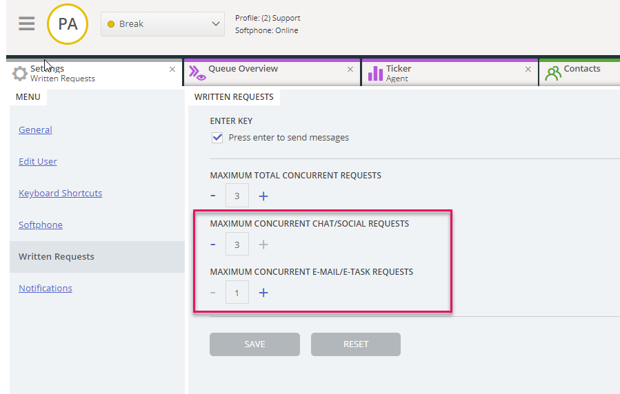 We are adding the support for defining the number of concurrent requests on a sub-level. This means that agents with access can change the maximum number of concurrent real-time requests (chat/social) and concurrent number of non-real-time requests (e-mail/e-task) individually, within the total number of written requests.