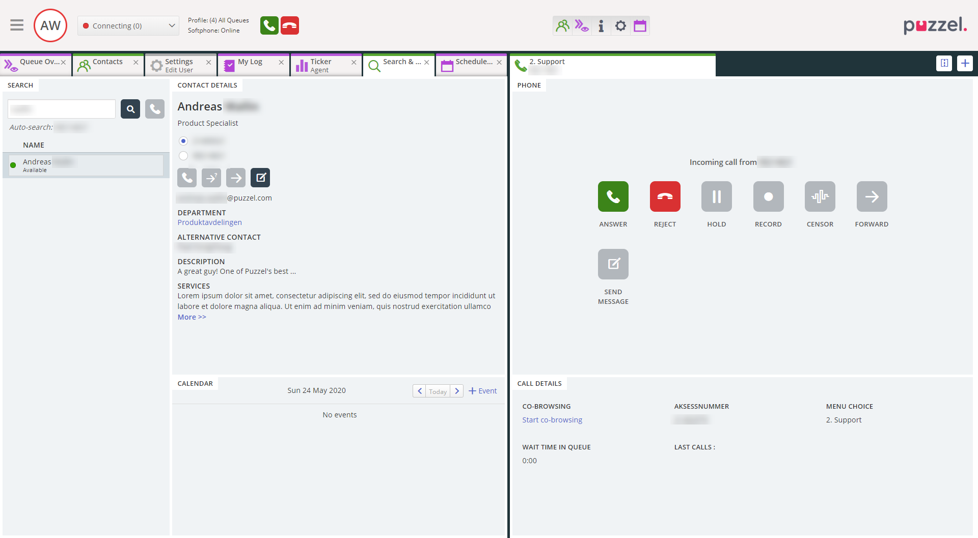 Auto-search can be enabled on incoming calls, based on a search variable e.g. caller’s number (default variable used is “client_call_search”). Also, if your solution is set up with a Catalog containing more than one “organization”, the search can be set up to only search in the organization the call is addressed to (e.g. based on access number). You can get assistance from Puzzel in setting up both these features.