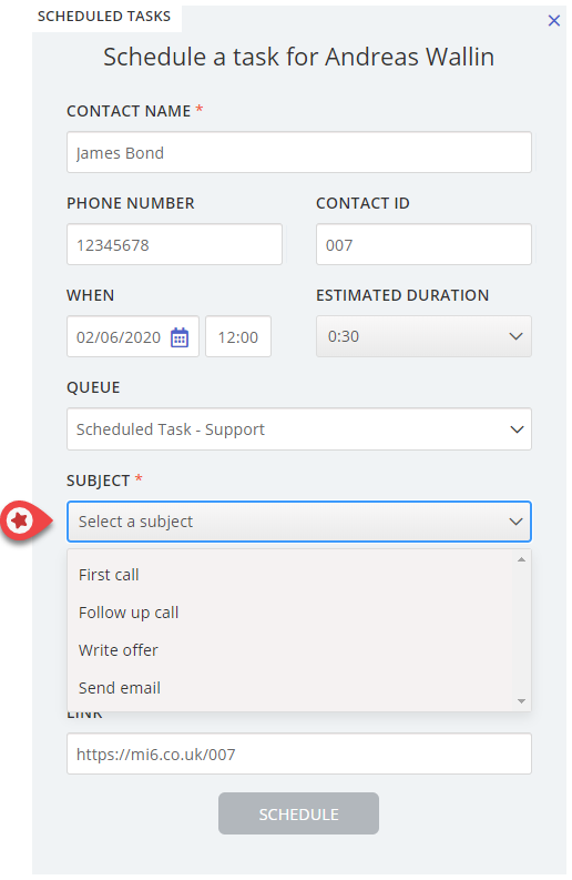 We are adding two improvements to the existing scheduled task feature, predefined subjects and adding scheduled tasks in call requests.