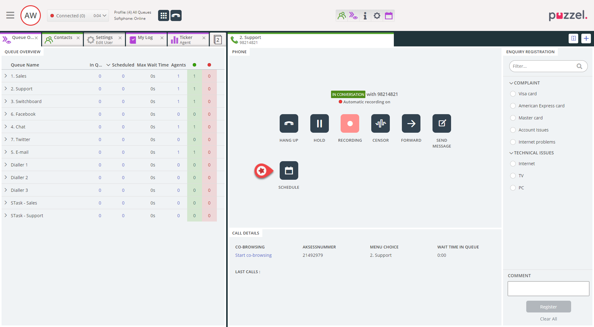 By pressing the “Schedule” button, the agent can add a scheduled task based on the call. The caller’s number (if available) is automatically added to the task, and a session-ID relation between the call and task is added in Admin Archive (will in a later release be related in raw-data, as well).