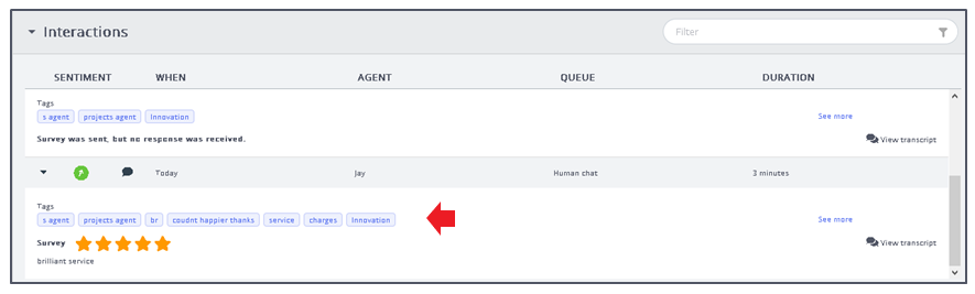 Historical interactions where the transcript is available and the ‘Interaction Analytics’ package is enabled; auto generated tags are shown to highlight the contents of the conversation. This helps to give an indication of what the conversation was about without reading the entire transcript.