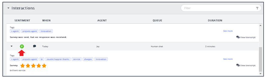 Historical interactions where the sentiment is available through the ‘Interaction Analytics’ package based on the transcript, a sentiment is shown with positive, neutral or negative icons. The score shown is an average of the conversation taken from the analysis of the customer dialog.