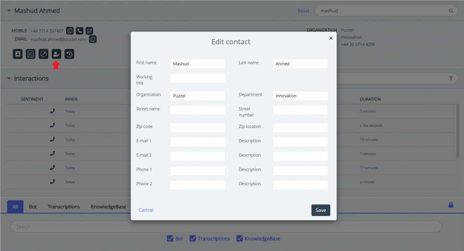 Note: changes in the contacts managed by Puzzel Agent Assist does not affect the source system if you are exporting contacts from an external CRM or contact management system.