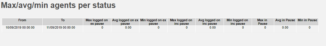 This report shows the maximum, average and minimum number of agents logged on and in pause, for the selected time period. The longest time period allowed is 31 days.