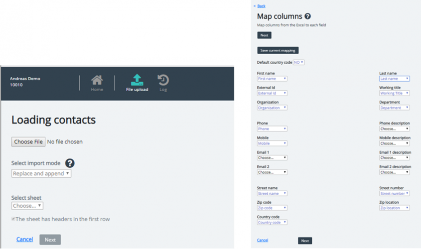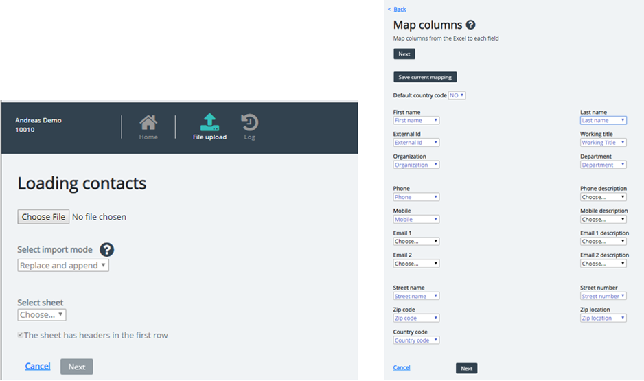 To upload a contact file, choose the file from your computer, do the column mapping and click Next to preview the first rows, and then start the import