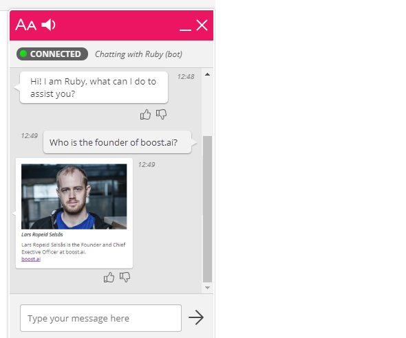 We are now supporting media-card messages for chatbot. With this, a set of predefined media-cards can be defined as json templates and pushed into the conversation between a customer and chatbot, as a message. The templates can contain pictures, texts and links. An example with a contact cards is shown below, but this can be user to display any kind of information, like opening hours, weather, products etc.