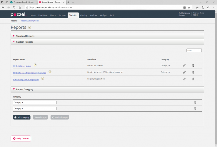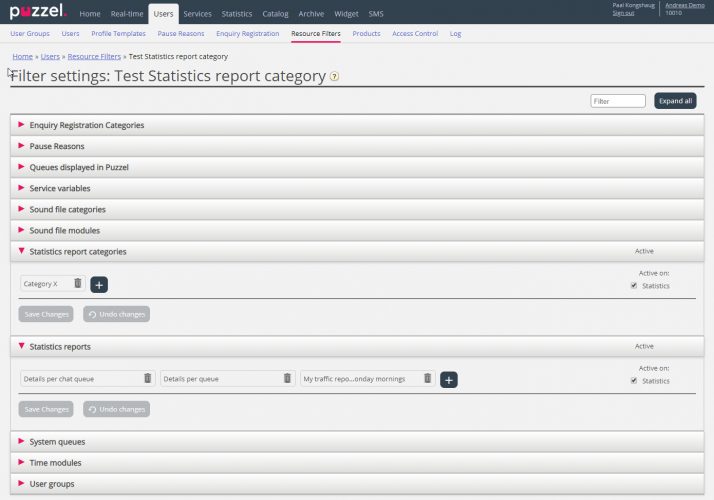 From now on you can limit what custom reports a user can see by utilising a new resource filter area called Report categories. On page Users – Resource filter you define and maintain your filters. For a selected filter, you can add one or more Report Categories to be included in the filter area Statistics report categories.