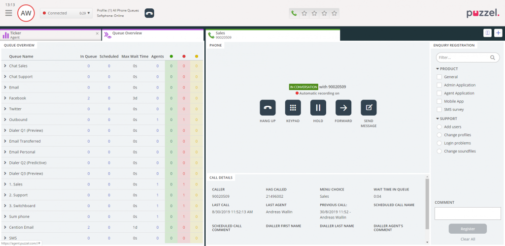 We have now added the support for embedding our agent application in Salesforce. With this, agents can receive phone calls, chats and e-mails in both Salesforce Classic and Salesforce Lightning. The application is about to be reviewed and approved by Salesforce and will be available in the Salesforce AppExchange.