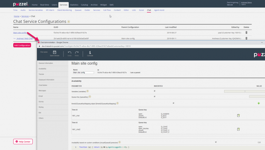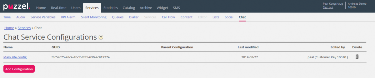 From this page you can create one or more chat configurations that can be used by your web-page(s) that offer chat. When you create a chat config, this config gets a GUID (Globally Unique Identifier). This GUID must be entered on the web-page that should use this chat config.