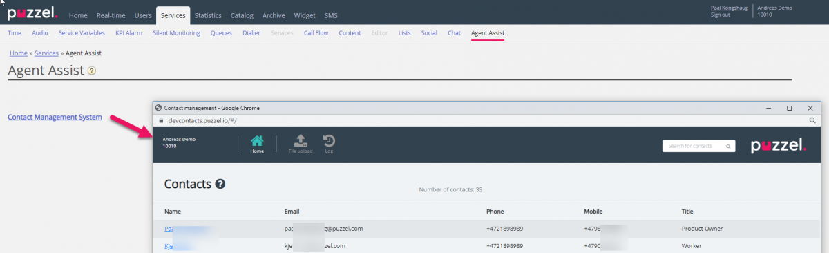 Agent Assist in the Puzzel Agent application needs the contact list so that the correct contact can be found and shown to the agent when the agent receives a call/chat/email.