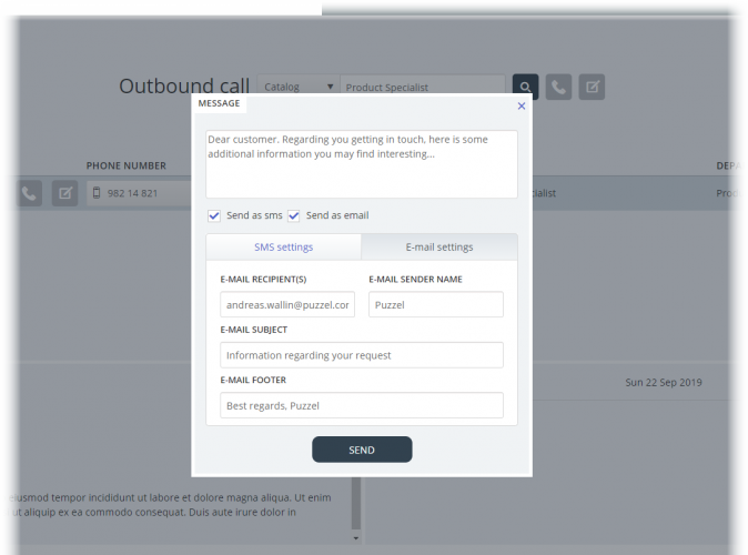 You can already send e-mails to contacts using your default e-mail application (standard mailto: feature), but we are now supporting sending e-mails written in the agent application. The feature is similar as to sending SMS’s to contacts and requires that e-mail server details are defined in the admin portal. With this you can choose to send a message as SMS, e-mail or both.