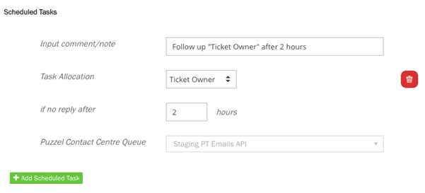 The Comment/Note is what text will be shown in task to the agent. The tasks can be allocated to the ticket owner or an individual agent. A time trigger must be included on when the task should be triggered, business hours only are counted.