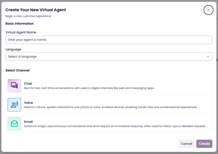 When creating a new Virtual Agent, the configuration has been simplified. Rather than selecting between several predefined templates, you now only choose the language and channel where the agent will operate.