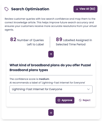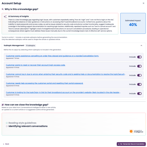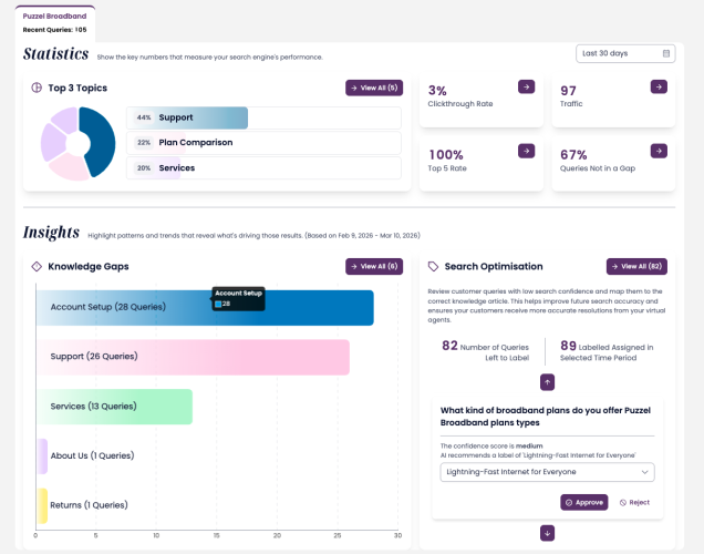 Using agentic AI, the system analyzes searches made by Virtual Agents or Puzzel Co-pilot and identifies areas where relevant knowledge may be missing.