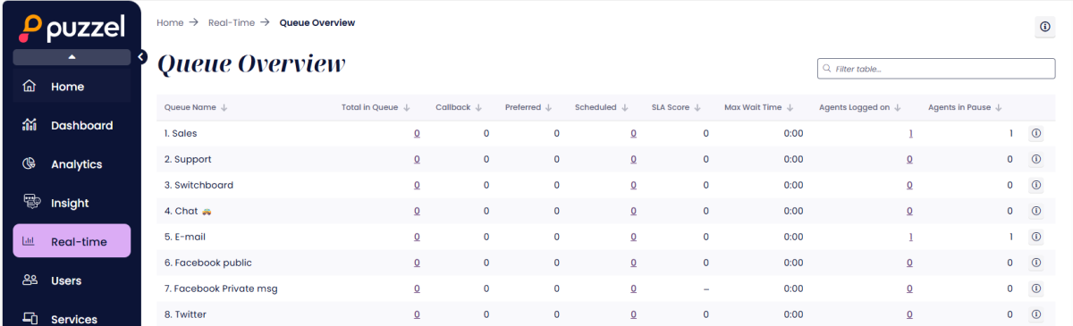 During the rollout period, you may notice the new version appear when you select a menu item (e.g. Queue overview, Ticker User groups or Wallboard) under Real-time as it becomes available to your account. Example: