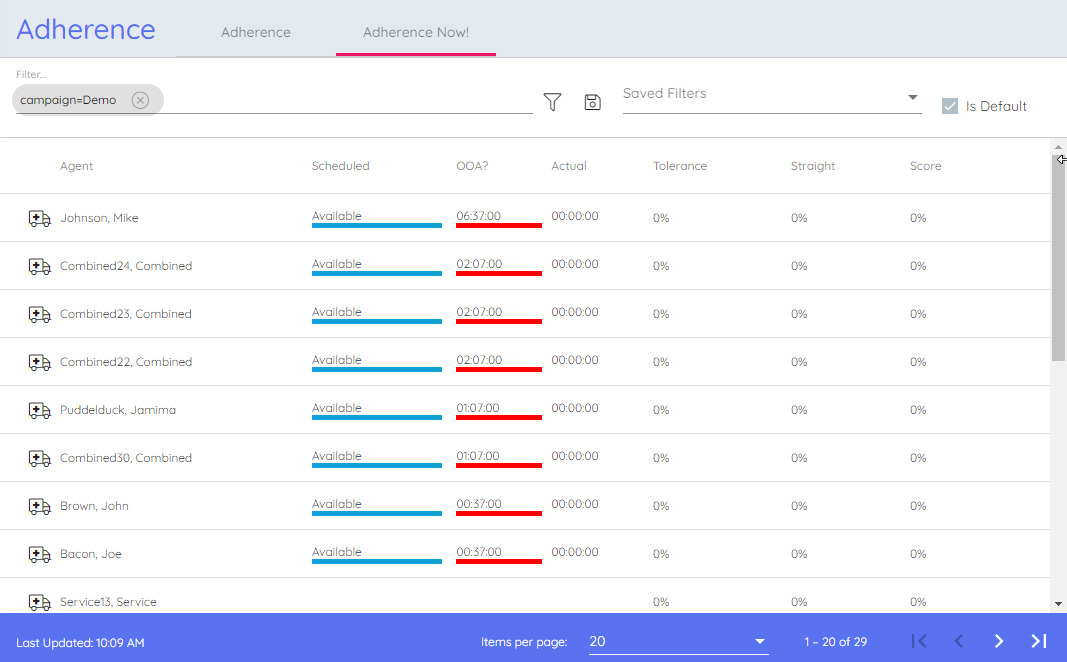 Adherence Now! is focussed on the current adherence state of your agents. The page refreshes every 30 seconds to show each agent’s current scheduled & actual activities, whether the agent is in adherence or not & their adherence scores so far today. Adherence scores for other days are still available on the Adherence page & Adherence reports.