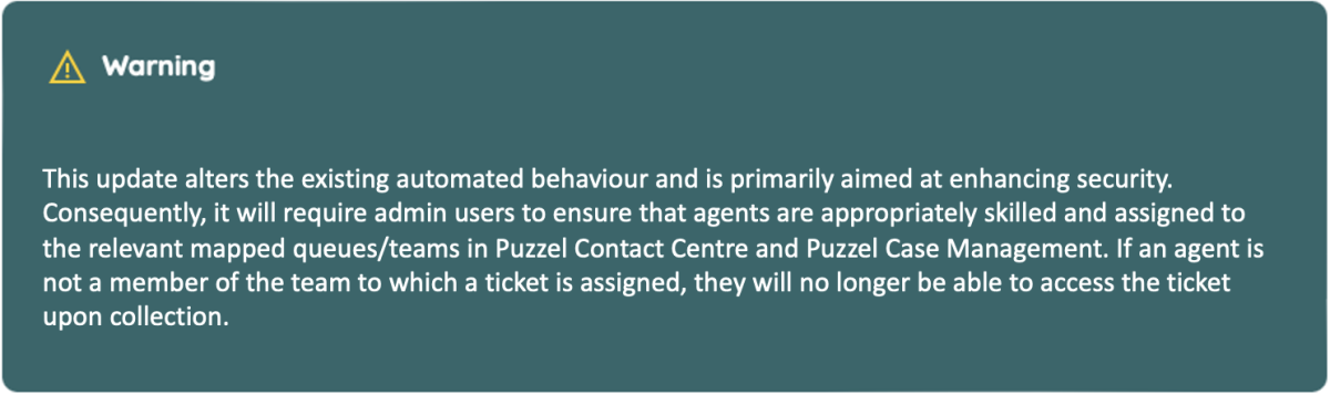 We are modifying a feature in embedded Puzzel Case Management / Puzzel Contact Solutions to bolster security and streamline user authentication processes. Previously, when an agent collected a ticket request assigned to a team they were not part of, they would automatically be added to that team in Puzzel Case Management. This functionality is being removed to reduce the risk of exposing sensitive ticket content due to potential administrative misconfigurations in the Puzzel Contact Center. This adjustment is also essential for clients utilizing Puzzel ID authentication.