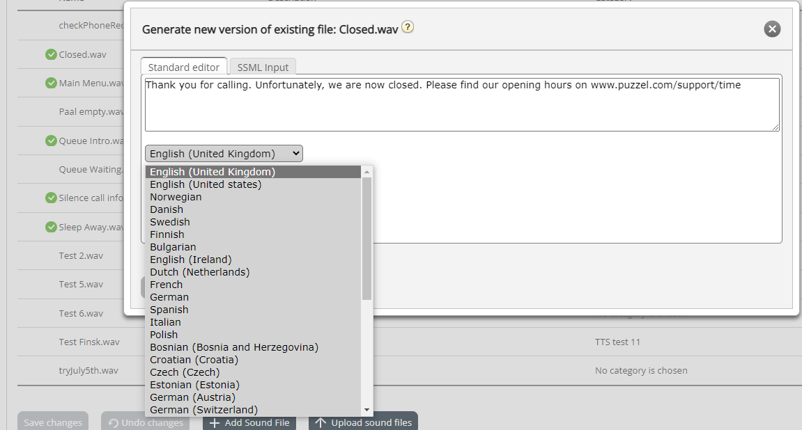 When you open the Generate sound file from text popup window on page Services – Queues under System queue settings, you can edit the script and select Language and Voice in the (default) Standard editor tab. Until now we have offered the ~10 most important European languages, but now we are adding around 20 more European languages to the list.