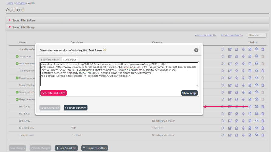 Today, you can input a plain text manuscript and select Language and Voice when you generate a sound file from text in the Admin Portal on page Services – Audio under Sound file library. In some cases, a generated sound file might not be good enough. In these cases you can accept the sound file anyway, or record the sound file manually.
