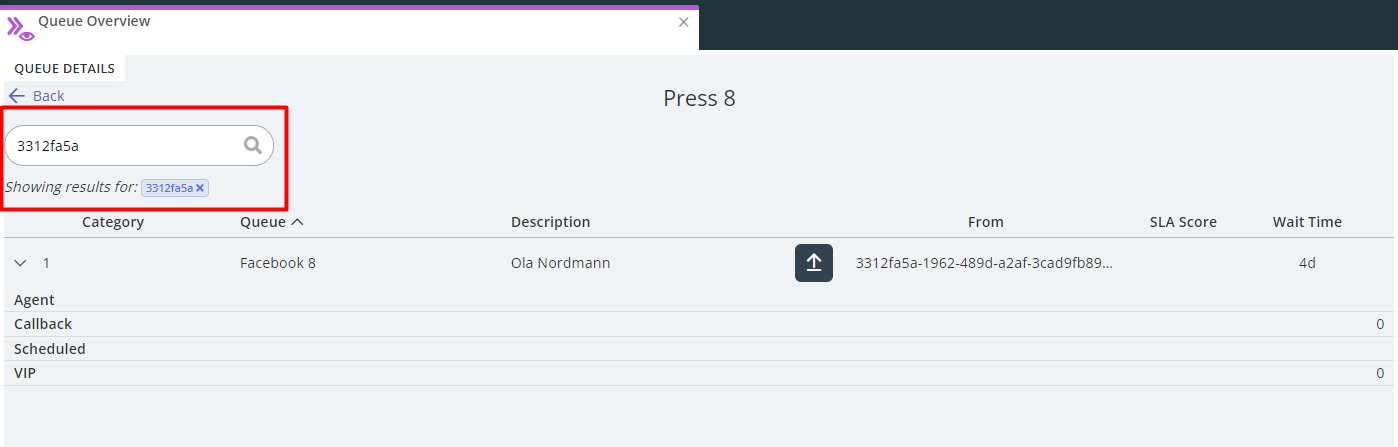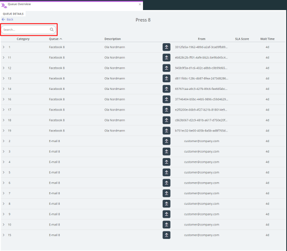 Some queues in may have many requests in queue. Usually e-mail queues have a lot of queued request and sometimes an Agent may need to find a certain request in the queue. Therefore we have introduced a search function when looking at Queue Details for a specific queue.