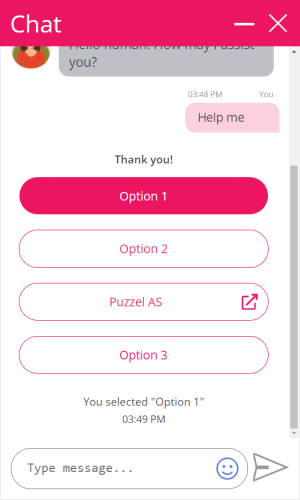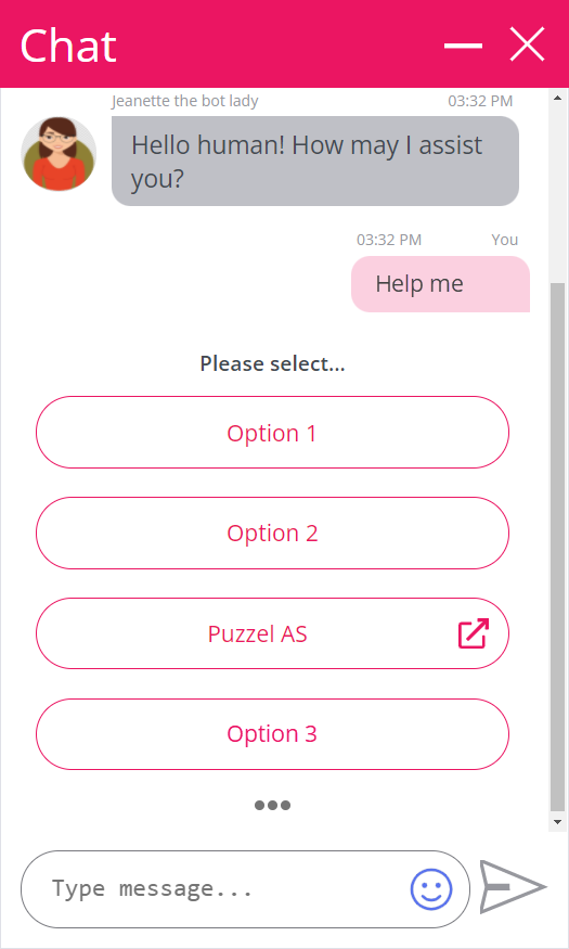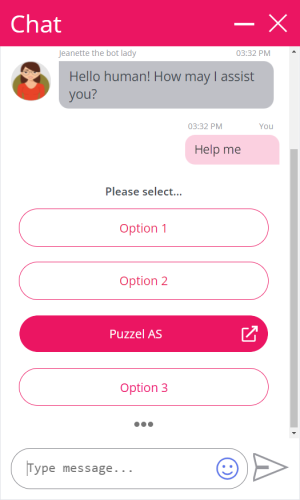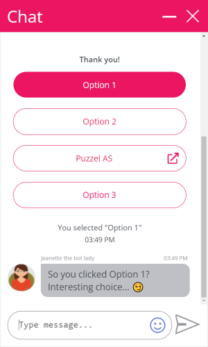 We are now supporting bots being able to send option buttons and link buttons in the same structured menu. Until now these have been shown as separate and independent elements. Link buttons are shown with an "external" icon on the right hand side and requires a custom setup in the bot script (KML), just like with the option buttons. Clicking on an option button will still take you a step further in the menu dialog, but clicking on a link button will open a URL in a new browser tab.