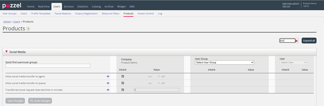 To give all agents or selected user groups access to transfer Social media requests to other agents and/or queues, Allow social media transfer to agent and/or Allow social media transfer to queue in the new accordion Social Media on page Users – Products must be turned on.