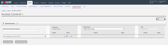 By default, admin users can not see accordion Social Media on page Users – Products, but customer main admins (with access to page Users – Access Control - Administration) can give all or selected admin users access to this new accordion by turning on Show pagegroup social media.