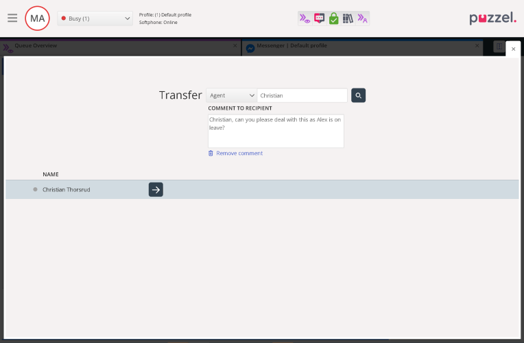 After clicking the button the Agent can then search for other Queues that support the social media type as well as other Agents that have social media as a skill. Offline Agents with social media as skill will also be shown as social media can be an asynchronous channel. When transferring the request a transfer comment can be added to the request describing the reason for the transfer.