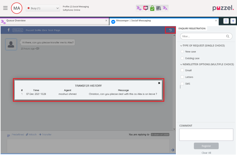 The receiving agent has visibility of the transfer history using the new transfer history button. The button is only visible if there are one or more comments added.