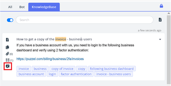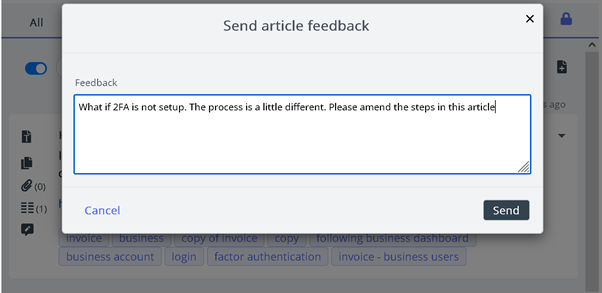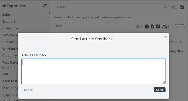 A popup window is presented for agents to provide the related feed. The sent feedback is available for admin users in the Knowledgebase Inbox.