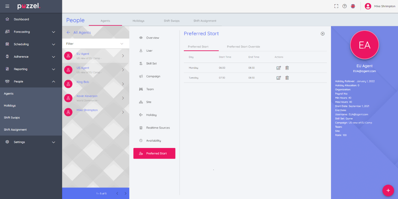 The Agent portal now allows agents to enter time ranges for each day of the week to indicate their preferred start time for that day. Entries made on the Preferred Start page will apply to every week.