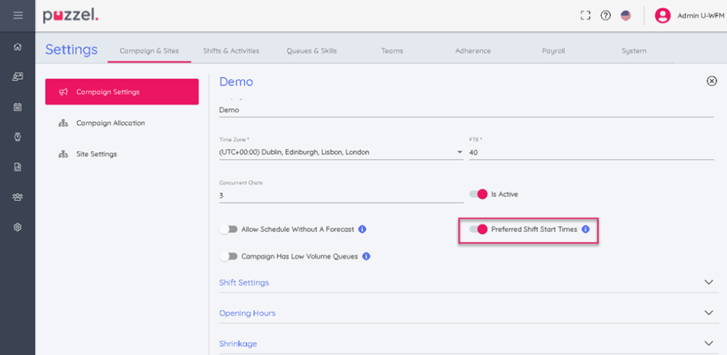 To use this feature, you must enable the "Preferred Shift Start Times" option for each campaign as shown in the image below.