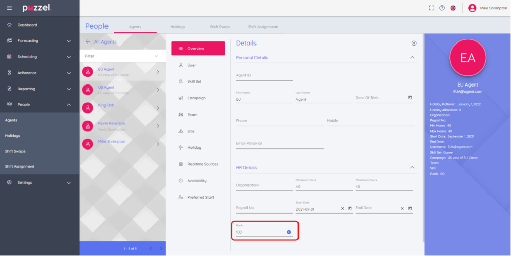 An agent's Rank is used to decide if the agent's preferences will be satisfied during the scheduling process. Rank value is a whole number between 1 and 100 and can be assigned to each individual agent. Agents with lower rank values will be given priority when assigning shifts with preferred start time.