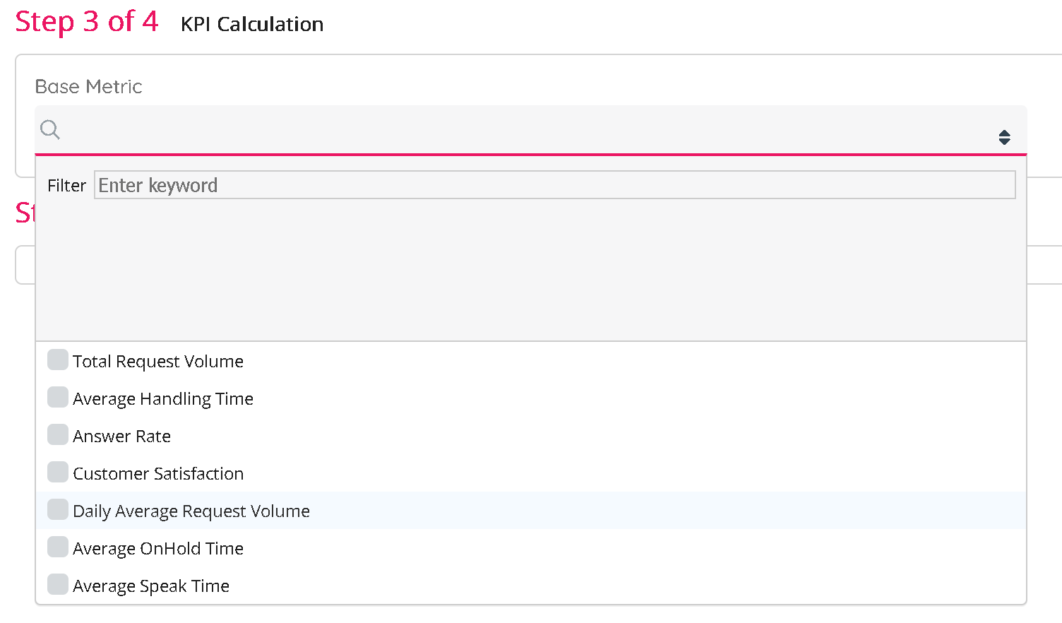 All base metrics are available under the KPI calculation section when creating KPI configurations. We provide some default values to get started and you can modify these to suit your needs.