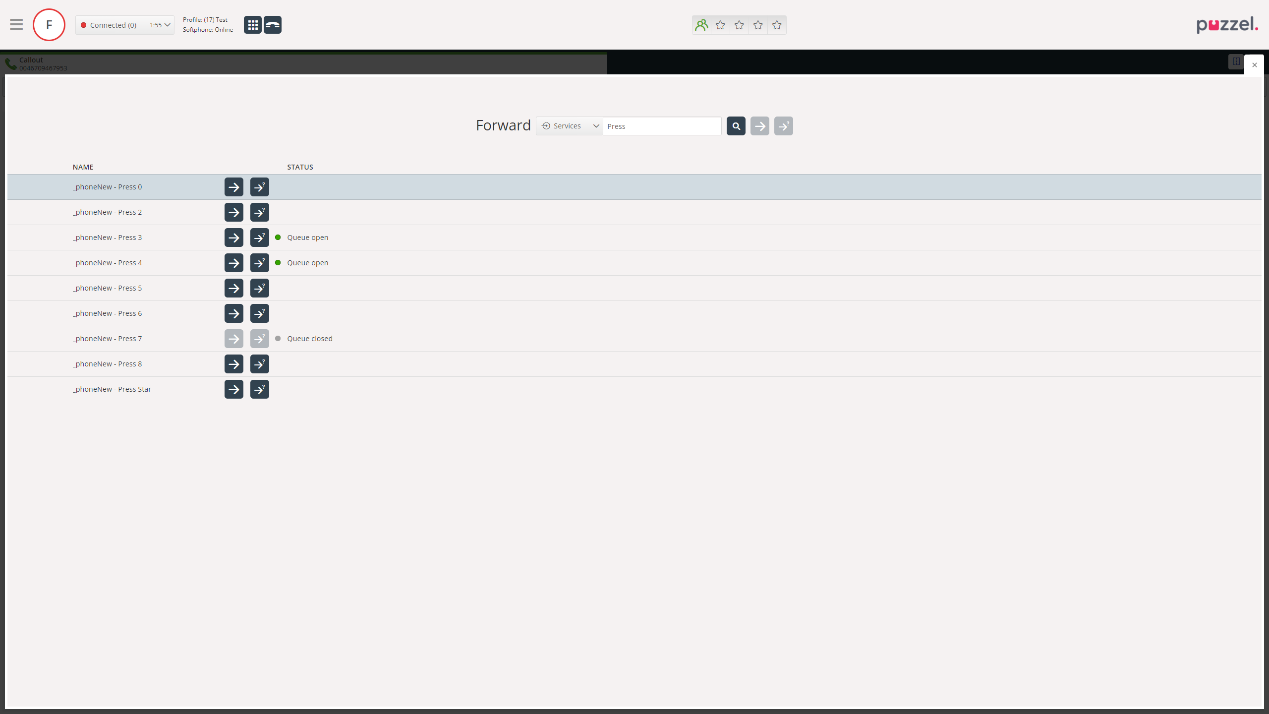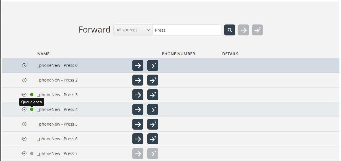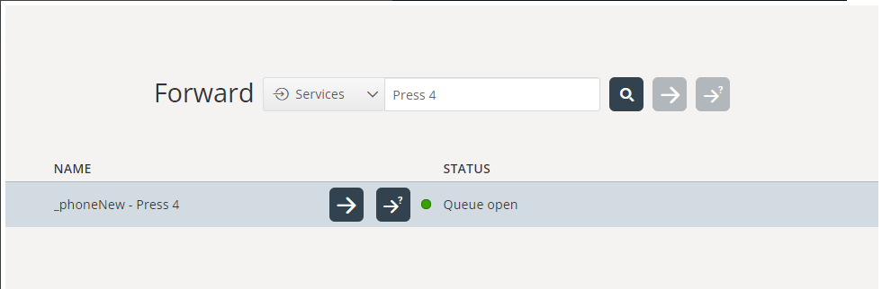 When an agent is connected to a call they may want to transfer or consult the call to another queue. This is achieved by using the "Forward"-button and searching for queues. When searching for queues it will now show the status of the queue, whether it's open or if it's closed, if it's linked to a time module. If the queue is not linked to a time module it will behave as before, the transfer and consult buttons will be enabled and no status text will be shown.