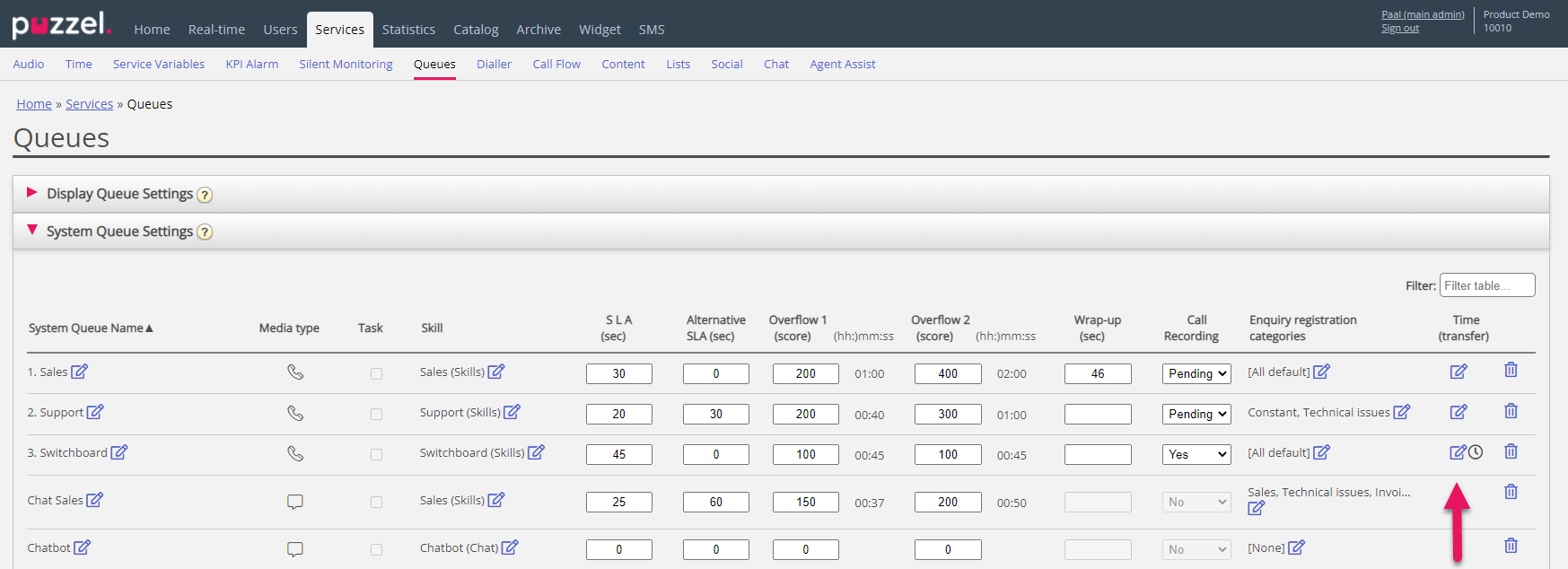 2) On page Services – Queues under System queue settings you can link the relevant Time modules to your phone queues.