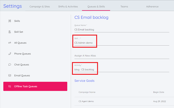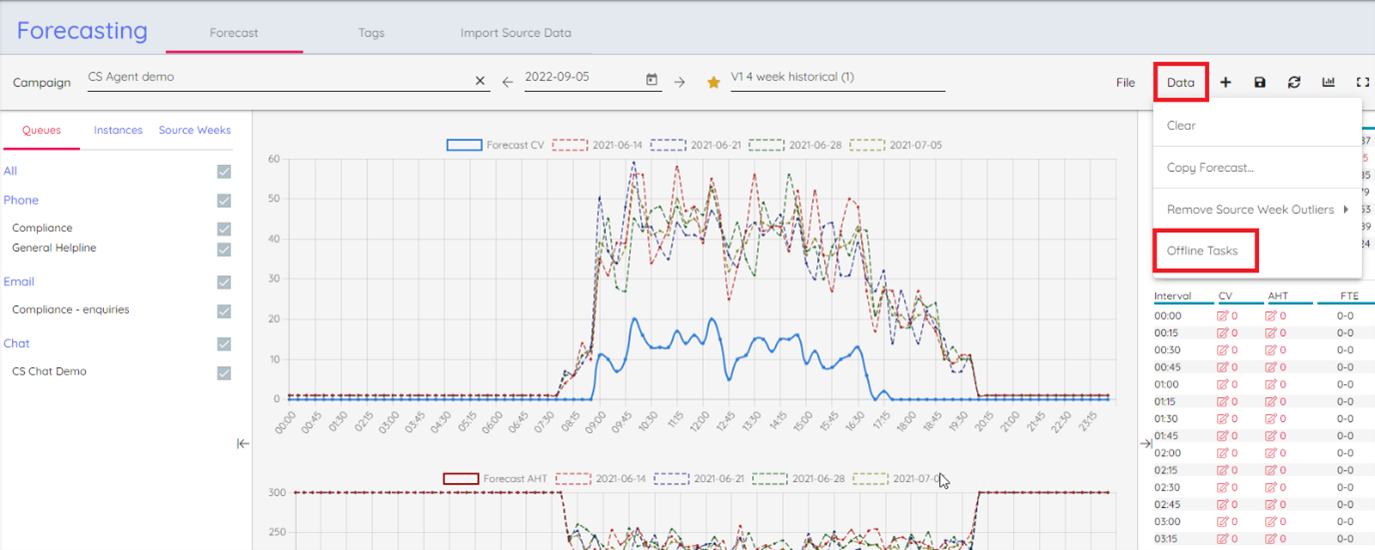 Adding a forecast for an Offline Task Queue (from the Data menu, Offline Tasks option), will instruct the schedule engine to assign an equal amount of that queue’s selected Activity to the agents that have the skill to work on the queue, in 15-minute blocks.