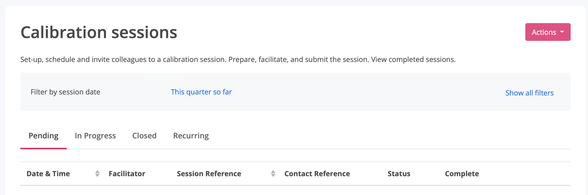 Here you can search for your calibration session based on the date of the session, the status of the session and the facilitator. By clicking the percentage complete number, a pop-up enables you to view who has and who hasn't completed their blind evaluation in preparation for the session.
