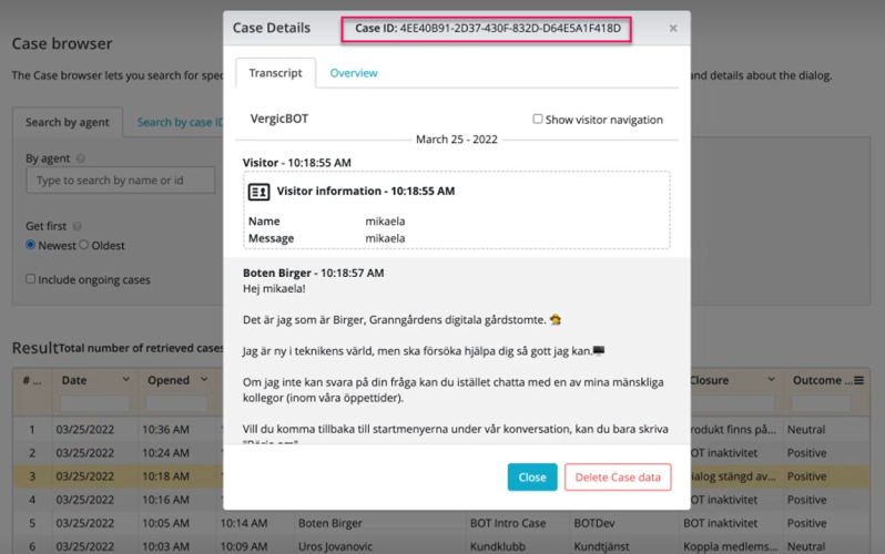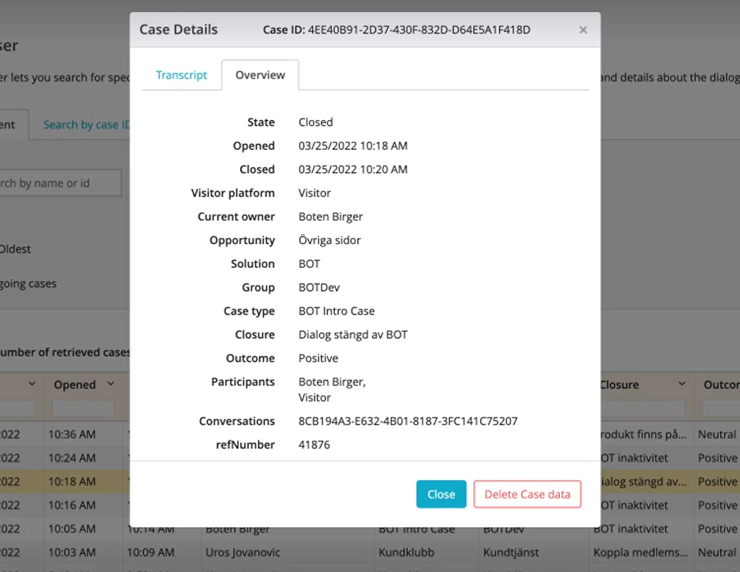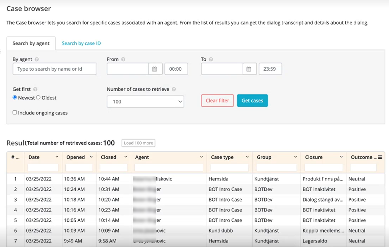 Case browser option allows you to search for a specific case/cases associated with an agent. You can specify a time range to list all the cases against an agent in that duration. Each record consists details about when the case was opened and closed, case type associated with it, the queue it was in, the closure and outcome of a case.
