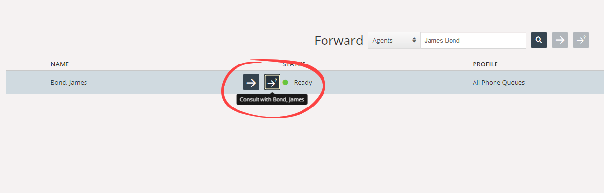 Om du vill konsultera med en annan agent, tjänstnod eller katalogkontakt anger du namnet på agenten, noden eller kontakten som du vill konsultera och klickar på sökknappen. Alla träffar i sökningen visas i sökresultatet. Du kan nu välja vem du vill konsultera genom att klicka på konsultationsknappen (pilen utan frågetecken) bredvid det relevanta namnet.