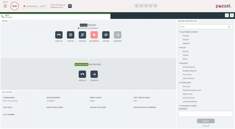Det är viktigt att du inte vidarekopplar ett samtal i Puzzel via ditt lokala telefonsystem (exempelvis PBX), eftersom Puzzel inte känner av detta och därför ger dig statusen i samtal tills det kopplade samtalet har avslutats.