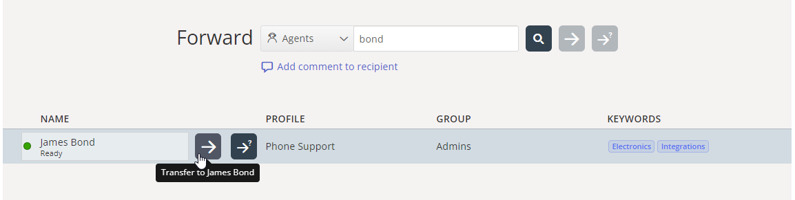 Om du vill koppla samtalet till en annan agent, tjänstnod eller katalogkontakt anger du namnet på agenten, noden eller kontakten som du vill överföra samtalet till och klickar på sökknappen. Alla träffar i sökningen visas i sökresultatet. Du kan nu välja att överföra samtalet genom att klicka på kopplingsknappen (pilen utan frågetecken) bredvid det relevanta namnet i sökresultatet.