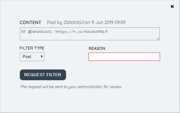 - Orsak - Här kan agenten ange orsaken till begäran. Man måste ange en meningsfull anledning, så att administratören kan vägledas ordentligt i orsaken bakom filterbegäran. När du begär ett filter av typen "Inlägg" bör du också ange en anledning som gör att inlägget kan identifieras unikt - till exempel "Marknadsföringskampanj 16 juni".