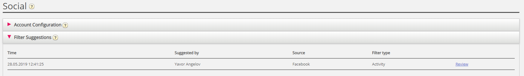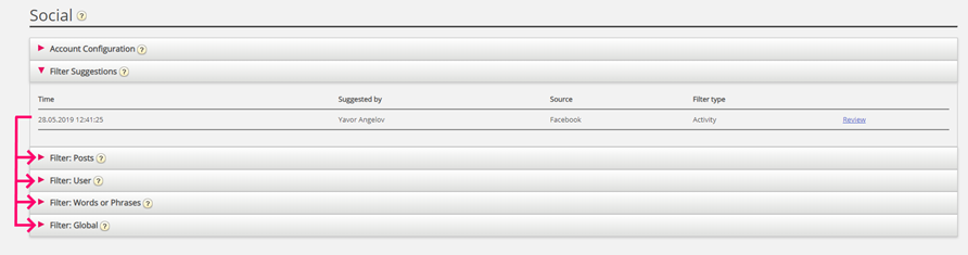 Varje filterförfrågan, innan den godkänns, är tillgänglig i avsnittet "Filterförslag", under fliken Social i Puzzel Admin.