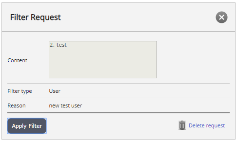 När alla fält är ifyllda kan du trycka på knappen "Begär filter". Detta tillämpar inte automatiskt ett filter. Filterförfrågan skickas snarare till en administratör för att granska. Detta hanteras vidare i Puzzel Admin.