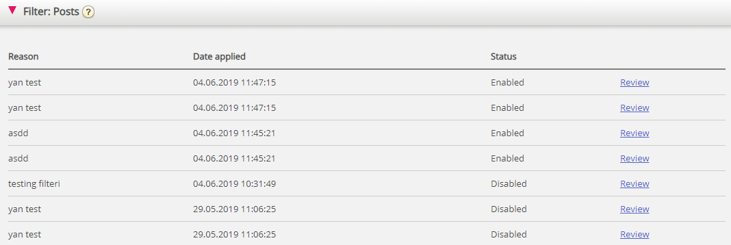 - Om de klickar på knappen "Apply Filter" tillämpas filterbegäran. Därefter kommer filtret att gå till det relevanta filteravsnittet, beroende på dess typ - Post, User, Word/phrase eller Global